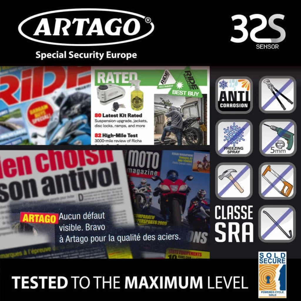Motosiklet güvenliğinde en ileri teknolojiyi temsil eden ARTAGO 32S, benzersiz S.A.A. üçlü kilitleme sistemi ile donatılmıştır. 15,5 mm sertleştirilmiş çelik şaftı, anahtar çevrildiğinde otomatik olarak açılan 3 çelik bilye ile kilitlenir. Böylece üç bağımsız kilit noktası oluşur ve ARTAGO’nun özel BUNKER SELECTION serisinin en güvenli disk kilidi haline gelir.